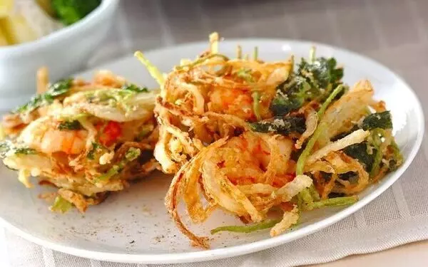 かき揚げにミツバを使うと、ほのかな苦みがくせになる主菜に。具材はむきエビ・ミツバ・玉ネギでシンプルにするのがポイントです。ミツバは細かく刻まず、4cm程度に切ると食感も見た目も良くなります。