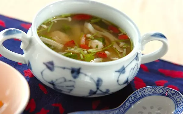 ナンプラーや赤唐辛子などを使ったトムヤム風スープに、ミツバをプラス。トムヤムクンにはパクチーを入れるのが一般的ですが、ミツバでもおいしいですよ。パクチー特有の香りが苦手な方は、パクチーに比べて香りがマイルドなミツバを選ぶのも一案です。