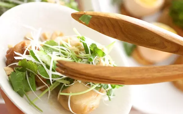 ミツバとパクチーを使う香り高いサラダ。紫玉ネギや細ネギも使うので、ひと口食べるとさまざまな香りと食感が広がります。牛肉の下味とドレッシングにナンプラーを入れ、アジアンテイストを楽しんでくださいね。エスニック通の方にも満足できますよ。