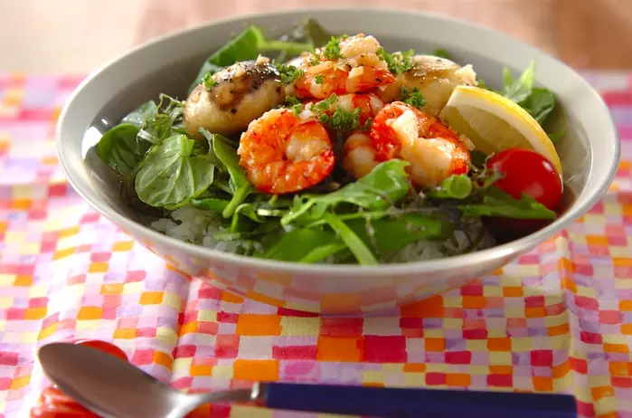 カロリーが高くなりやすい丼メニューは、高タンパクで低カロリーなエビなどをメインに使うことによって、ダイエット中でも安心して食べられる丼に。ご飯をしっかり食べる丼メニューの時には、糖質をエネルギーに変えてくれるビタミンB1を含む卵やささ身等の食材を合わせることによって、糖質の代謝を助けるダイエットにも効果的な献立になります。