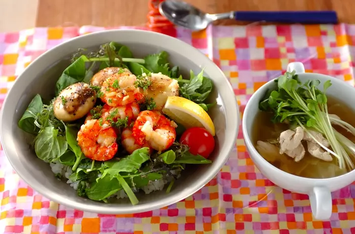 「あっさりした味付けだと物足りないのでは?」と思いがち。でも低脂肪で高タンパクのエビにガーリックをたっぷり使ったハワイの名物、ガーリックシュリンプは、パンチのある味付けで満足感が得られます。ベビーリーフがのっていて見た目も華やか。体脂肪燃焼に効果的なショウガを効かせた具だくさんのコンソメスープを合わせて、代謝を上げて、痩せやすい体を作りましょう。