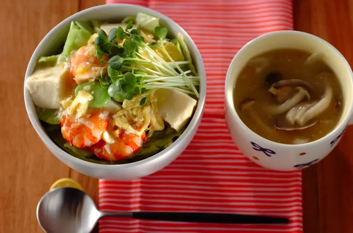 丼と汁物合わせて1人分472kcalの献立です。カロリーが高くなりやすい丼ですが、低脂肪でタンパク質が豊富なエビに卵と豆腐、そしてソラ豆でビタミンをプラス。カロリーをおさえた満腹感のある丼に仕上げています。アサリの出汁とシメジのうま味たっぷりのみそ汁を添えました。