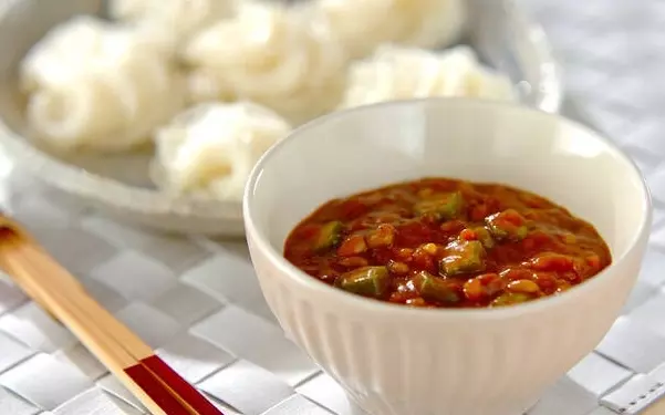 ミートソースにオクラと納豆を入れてトロミをつけてから、カレールウを加えてこっくりと仕上げます。つけダレが素麵によくからんでおいしいですよ。