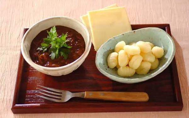 麺の代わりにニョッキを使う変わり種メニューです。つけダレのカレーの隠し味は、すりおろしリンゴとインスタントコーヒー。トッピングしたチーズがカレーの熱で溶けて、たまらない味わいに。