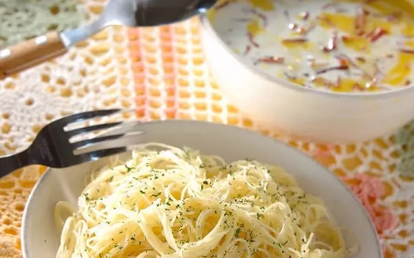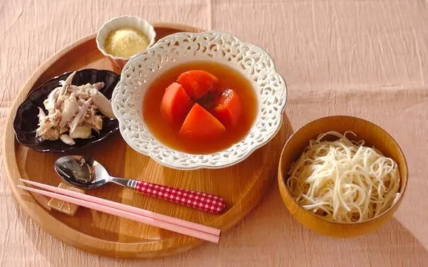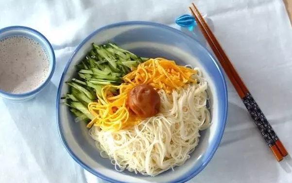ミルクベースのつけ汁を使う洋風の素麺です。梅干し入りで後味がさっぱりしているため、食欲がないときにもおすすめ。簡単に作れるのでひとりランチにも最適です。