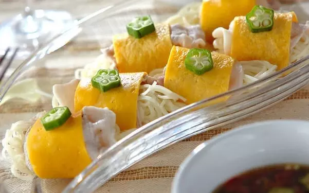 プチトマトとオクラを混ぜ込む、涼やかなつけダレです。素麺を豚肉と薄焼き卵で包んで、星に見立てたオクラを飾ればオシャレな一品が完成! 来月は七夕。家族のイベントメニューにいかがでしょうか。
