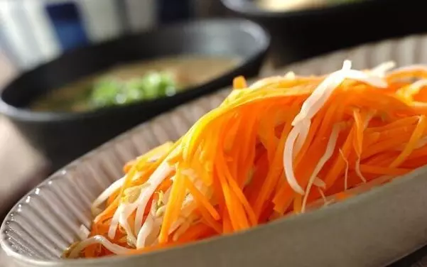 細切りニンジンとモヤシを麺風にアレンジ。ニンジンは塩茹ですることで甘みが引き出されます。カロリー控えめですが、ゴマのコクと風味で食べ応え十分。ダイエット中にもうれしいレシピですね。