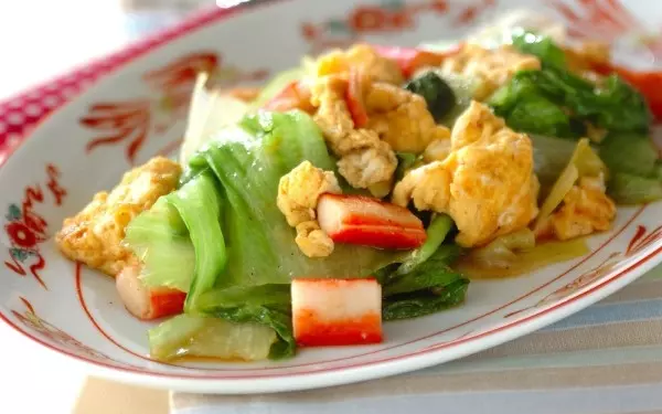 レタス・卵・カニカマの彩り豊かな一品です。いずれも火が通りやすい食材なので、短時間で作れます。卵は先に炒めておき、レタスは強火でサッと炒めるのがおいしく仕上げるコツ。しっかり味でご飯も進みます。