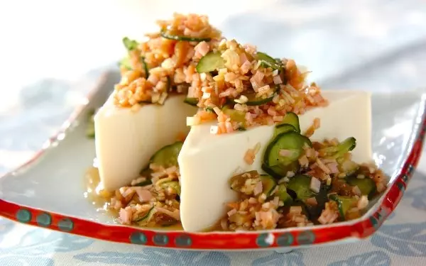 暑い日に食べたくなる「冷奴」をザーサイを使って、おつまみにアレンジ! 刻んだハム、ザーサイ、白ネギ、キュウリを調味料で和えたら、豆腐にのせるだけでOK。ゴマ油と酢が効いたタレが薬味とマッチして、ビールにもご飯にも合う一品です。