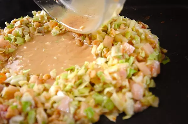 2、<もんじゃ生地>を混ぜ合わせる。