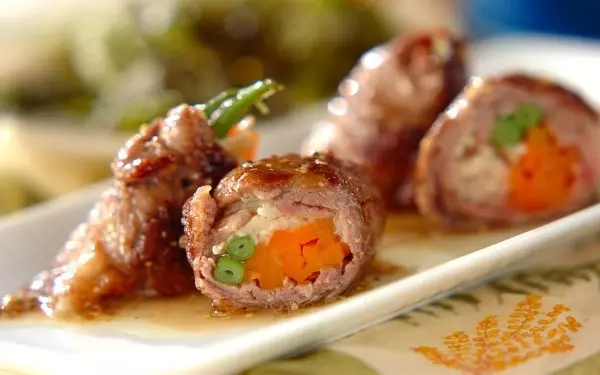 牛肉にニンジン、インゲン、エノキを巻く、色鮮やかな一品です。それぞれの食感の違いもアクセントに。マリネ液に漬けることで、ボリュームがありながらもさっぱり食べられます。