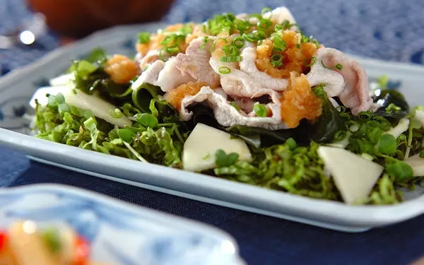 豚しゃぶサラダにワカメを組み合わせた、アレンジレシピです。食感の違いが楽しく、箸が進みます。さっぱりした具材にかけるのはおろしダレ。大根おろしとポン酢しょうゆを混ぜればよく、短時間で作れるのが魅力です。