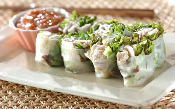 豚しゃぶサラダをライスペーパーで巻いて、生春巻き仕立てにアレンジ。食べやすく、パーティーに喜ばれる一品に仕上がりますよ。茹でた豚肉と野菜をライスペーパーで巻いたら、酸味が効いた梅肉をつけていただきましょう。紫玉ネギやパクチーなどとも相性が良いです。