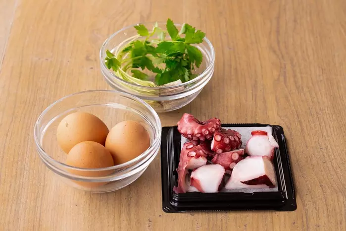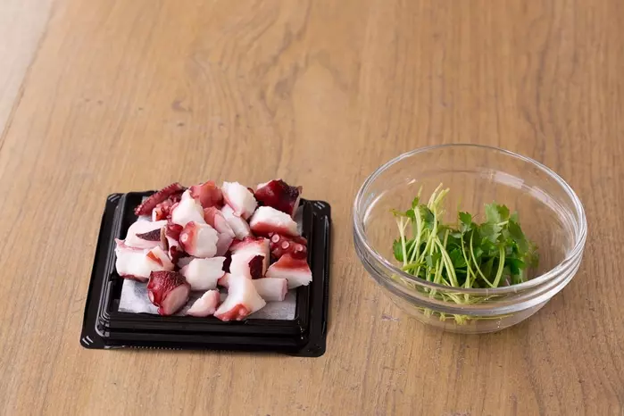 1、タコは一口大に切る。三つ葉は食べやすい大きさに切る。
