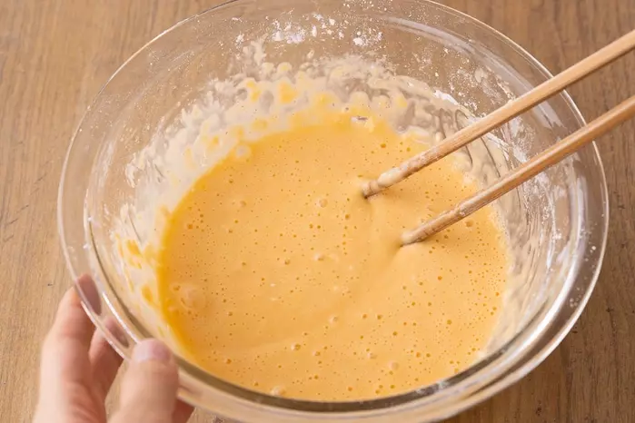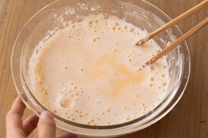 2、ボウルに薄力粉、卵を入れて混ぜる。さらにAを入れて混ぜる。