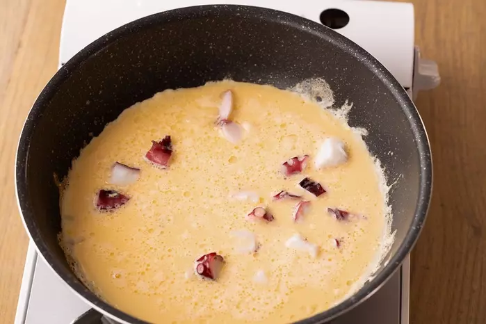 3、フライパンでサラダ油を中火で熱し、2とタコを半量ずつ入れる。オムレツを焼くようにかき混ぜながらだえん形になるように形を整えて焼く。4〜5分焼いたら皿に取り出す。2個目も同様に焼く。