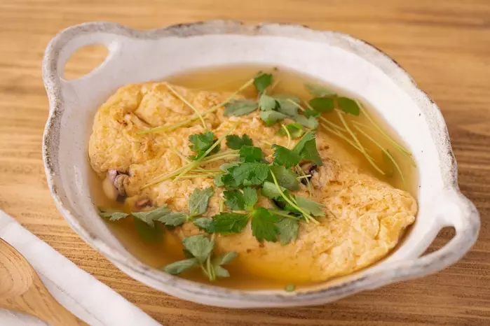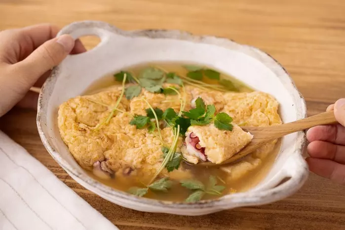 和風のだし汁につけて口に入れたら、じゅわっとうま味が広がりますよ♪プリプリなタコの食感とふわふわの卵の食感がたまらないおいしさなんです!