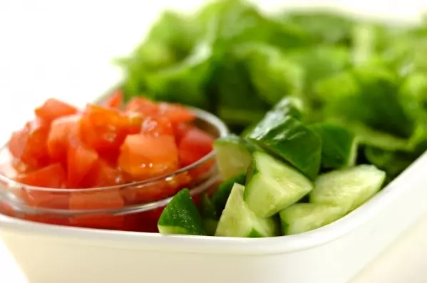 1、ボウルで<調味料>の材料をよく合わせ、サンチュ、キュウリ、トマトをよく和え、器に盛る。