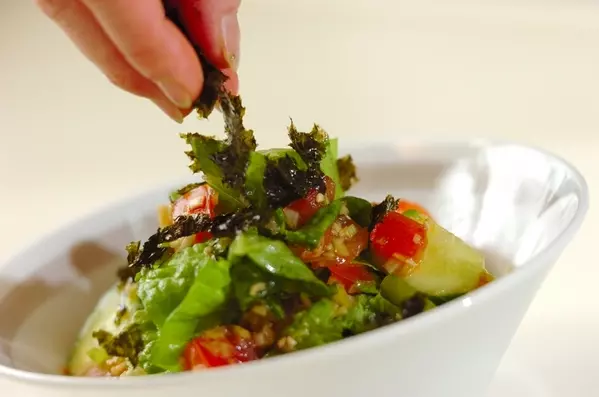 2、韓国のりをちぎって散らす。