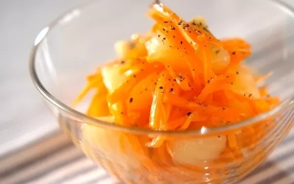 酢・オリーブ油・砂糖・塩で味付けするオーソドックスなキャロットラぺです。調味料をあらかじめ混ぜておき、軽く茹でたニンジンを和えます。オリーブ油がしっかりなじむよう、泡だて器で丁寧に混ぜておきましょう。冷蔵庫で約1週間ほど日持ちするので、常備菜にもおすすめです。