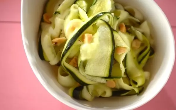 ズッキーニを生のまま使う、簡単ラぺです。リボン状にスライスするため、おしゃれな見た目に仕上がりに。レモン汁や砂糖などにみじん切りにしたピーナッツを加えるのが味の決め手。あっさりとしたズッキーニにコクがプラスされて絶品です。