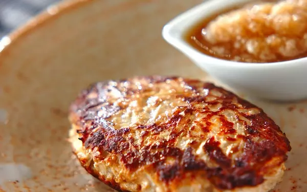 さっぱりしたラぺには、しっかり味の主菜が合いますよ。こちらは鶏ひき肉を使ったハンバーグ。肉ダネにウスターソースを加えるため、コクと風味が豊かに仕上がります。ささがきにしたゴボウの食感と香りも抜群のおいしさです。