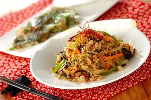 脂肪分の少ない鶏肉を使ったヘルシーなチャプチェ。野菜を一度ゆでてから炒め合わせると、炒める油の量をカットできます。低カロリーなのにボリューム満点のチャプチェと、大根おろしで作った大根餅のようなもっちり食感のチヂミを合わせました。チヂミの生地にかたくり粉を使うことで中はもっちり外側はかりっと仕上がります。