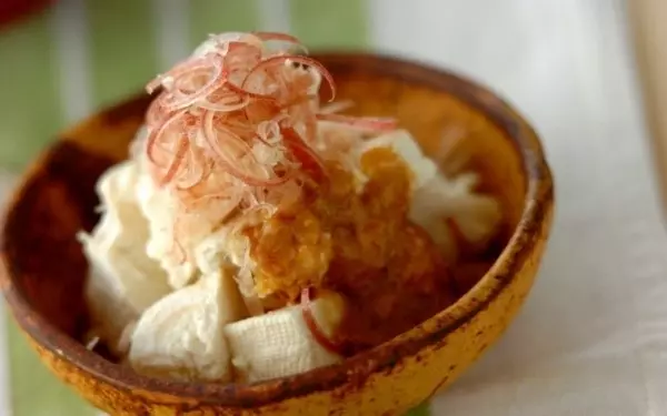 アボカドのクリーミーなコクとミョウガの清涼感が意外にもマッチ! 薄切りにしたミョウガをたっぷりのせ、ワサビじょうゆをにつけていただきます。和洋折衷が一品が味わいたくなったら、ぜひトライを。