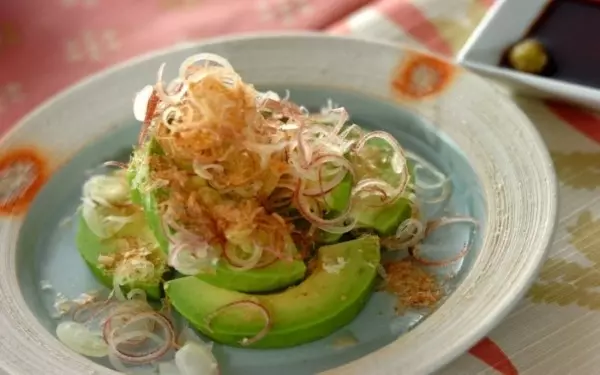 アボカドのクリーミーなコクとミョウガの清涼感が意外にもマッチ! 薄切りにしたミョウガをたっぷりのせ、ワサビじょうゆをにつけていただきます。和洋折衷が一品が味わいたくなったら、ぜひトライを。