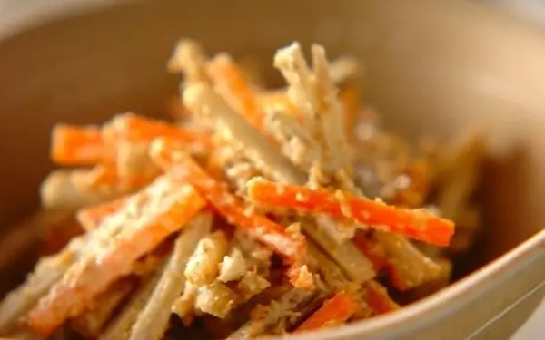 冷やし中華の具材は野菜が多いので、肉や魚のおかずをプラスすると、グッと満足度が上がります。また温かいスープを合わせると、体の冷え防止にもなっていいですね。・ゴボウとニンジンのゴママヨサラダ