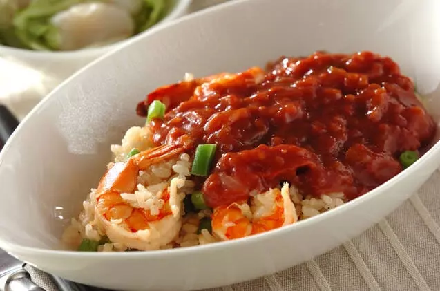・トマトソースがけエビピラフ
