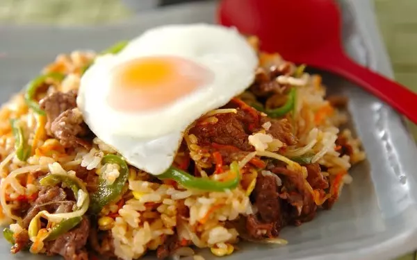 人気メニューの「焼肉」と「チャーハン」を合体! ビビンバのような旨辛味で、たまらないおいしさです。お肉と野菜をバランス良く食べられるのも魅力。半熟卵の目玉焼きをのせてから召し上がりください。辛さはお好みで調整してくださいね。