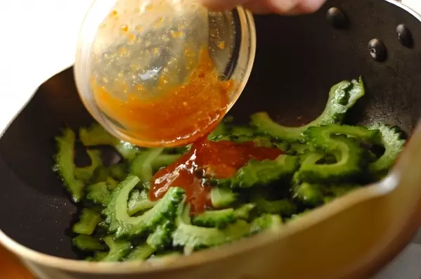 1、フライパンにサラダ油を中火で熱し、ゴーヤがしんなりするまで炒める。