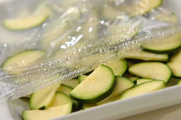 1、ズッキーニはヘタを切り、縦半分に切って幅5mmの半月切りにし、水に通す。耐熱皿に入れてラップをし、電子レンジで2分加熱し、ザルに上げて水気をきる。