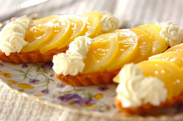 レモン風味のさっぱりしたカスタードをタルトに乗せたおしゃれなスイーツです。タルトは市販品を使うと簡単に作れます。また、コンポートにしたレモンは、飾り用だけでなく、紅茶に入れたり、炭酸に入れたり使い勝手抜群。たくさん作っておくと便利です。