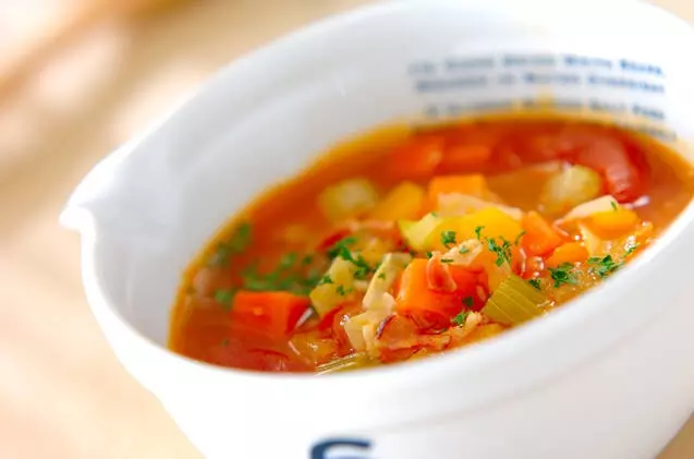 たくさんの野菜とベーコンをトマト缶で煮込んだミネストローネ。なんと100kcal以下で作れます。野菜のうまみがスープに溶け込んでいます。忙しい日の朝は、この具沢山スープにオートミールを入れてリゾット風にしても◎