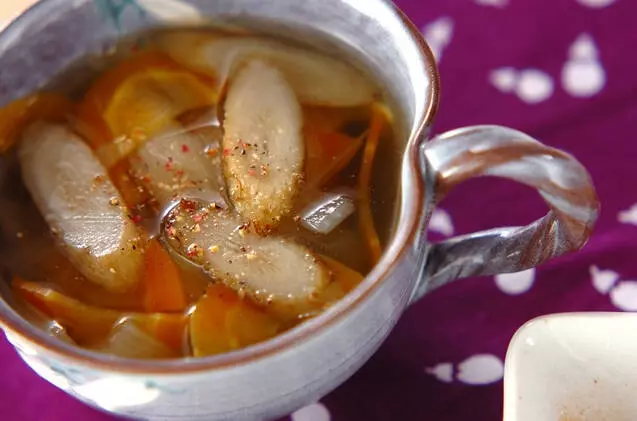 食物繊維が豊富なゴボウがたっぷり食べられる和風スープは、トータル58kcalと低カロリー。ダイエット中に小腹が空いた時にオススメです。しっかり噛むことで満腹感が得られます。