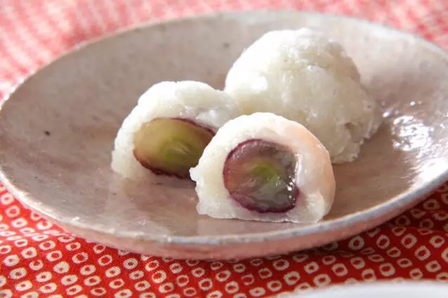 ジューシーな巨峰を一粒包んだ、手作りの大福です。白こしあんとの相性抜群です。秋のお月見にいただきたいですね。巨峰は最初に熱湯でサッと茹でましょう。
