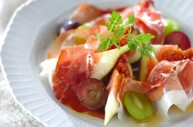 生ハムとぶどうやマスカット、イチジクを組み合わせました。旬のフルーツとの組み合わせで季節感あるオシャレな1品に。ドレッシングにブランデーを加えた大人の味わいです。