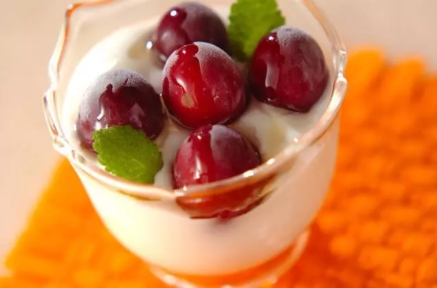冷凍庫で凍らせたブドウをヨーグルトに盛って、ハチミツで甘みをプラス。シャーベットの様な食感がおいしいですよ。ぶどうは冷凍すると日持ちするので、大量消費におすすめです。