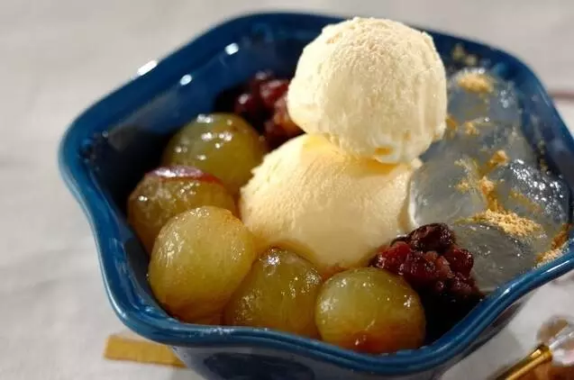 ぶどうとわらび餅を組み合わせた、和風のデザートです。バニラアイスやゆで小豆を加えて、簡単パフェの出来上がり!ぶどうは粒が大きい方が皮を剝きやすいですよ。