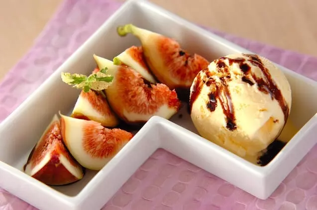 イチジクに甘酸っぱいバルサミコソースをかけてバニラアイスを添えれば、お店の様なデザートに!ソースはバルサミコと水あめを合わせたものです。手軽に作れるのが魅力です。