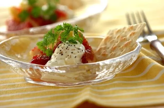 水きりヨーグルトはまるでチーズのような味わいです。イチジクとも良く合いますよ。クラッカーと一緒にいただけば、お酒のおつまみにもおすすめです。彩り良いので前菜にぜひ。