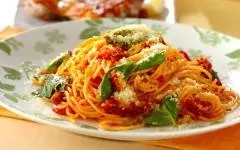 7、(5)のソースに(6)のスパゲティーを加え、加熱しながらからめる。粉チーズを加え、ひと混ぜしたら器に盛る。仕上げに粗びき黒コショウをかける。