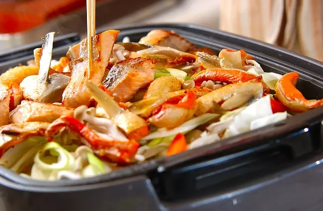 脂控えめの秋鮭と鮭のハラスやイカ、たっぷりの野菜ときのこを味噌バター味でいただきます。ホットプレートで簡単に調理できるので、家族の多い方にもおすすめです。