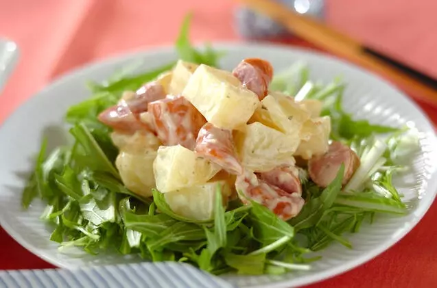 レンジでチンしたジャガイモとソーセージで作る簡単サラダは、市販のタルタルソースで和えるだけ。タルタルの酸味がジャガイモの甘みとソーセージの塩気をまとめてくれます。