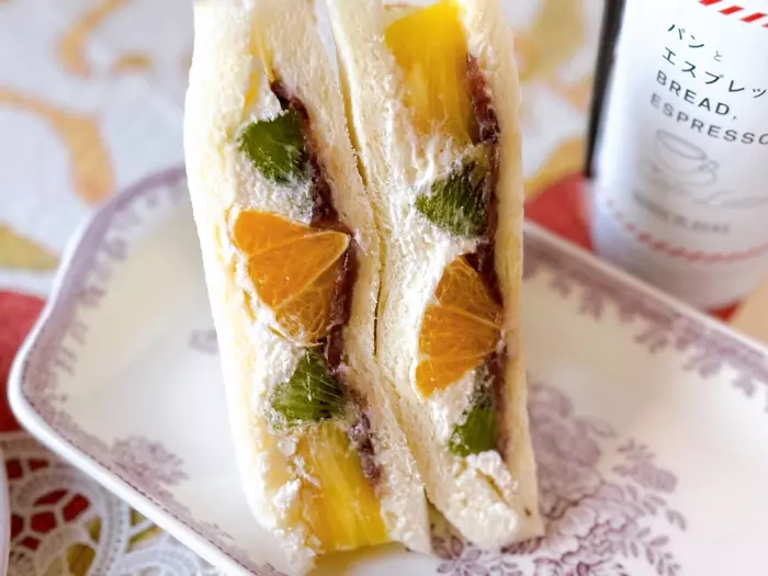 フルーツサンドにあんこと求肥(ぎゅうひ)が入っている…?!ちなみに求肥は、和菓子によく用いられる材料で、白玉粉や餅粉に砂糖や水飴を加えて練り上げたものです。どんな相性なのか気になります…!
