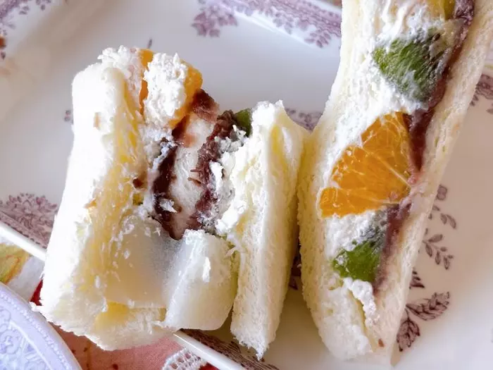 中を見ると、ころっとした求肥(ぎゅうひ)を発見!フルーツと一緒に食べると、これが合う!夫は今回の中でサンドイッチが1番気に入っていました。「お餅が入っていて、フルーツサンドがさらに美味しい!」とのことです。私も共感です!ホイップクリームと餡子がベストマッチで、果物の甘みと酸味も丁度良くて、美味しかったです!フルーツいっぱいなので、朝食に食べたい味わいです。