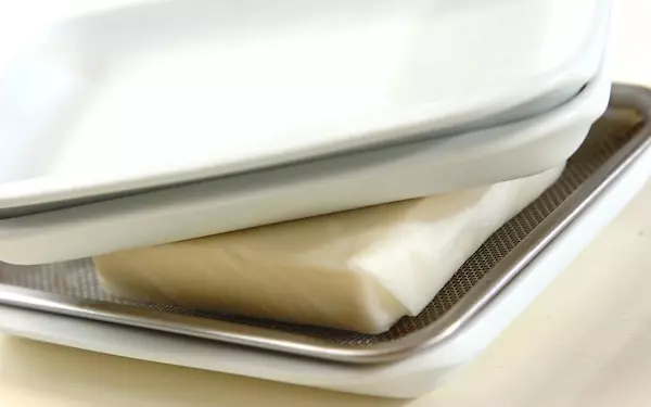 水切りのオーソドックスな方法です。水分をしっかりと減らしたいときには、その上に平らなお皿などを置き、重しをのせて10分ほど時間をおきます。型崩れを防ぎたいときや煮物に使うときに向いている方法です。