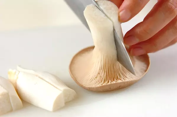 1、エリンギは長さを半分に切り、縦に厚さ3mmの薄切りにする。